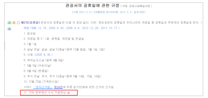 우리나라 공휴일은 법령에 따라 지정이 되는데, 정부에서 수시로 지정하는 임시공휴일도 포함이 됩니다.