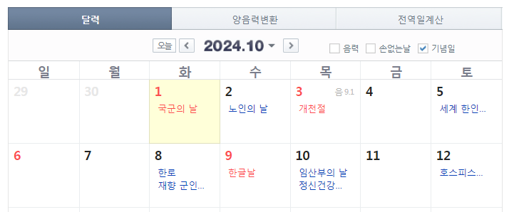 지난 9월 3일 화요일 국무회의에서 2024년 10월 1일 국군의 날을 임시공휴일로 지정하기로 의결했다고 합니다.
